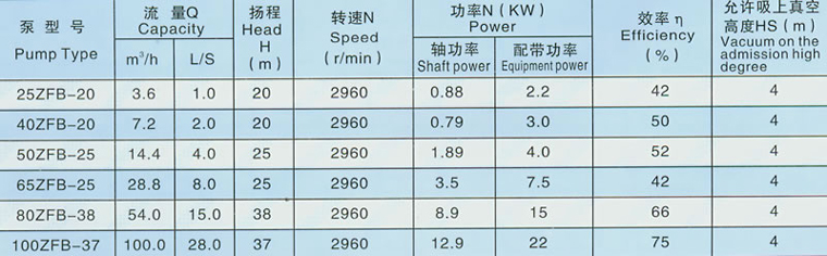 ZFB型耐腐蝕離心泵工作性能表 | |