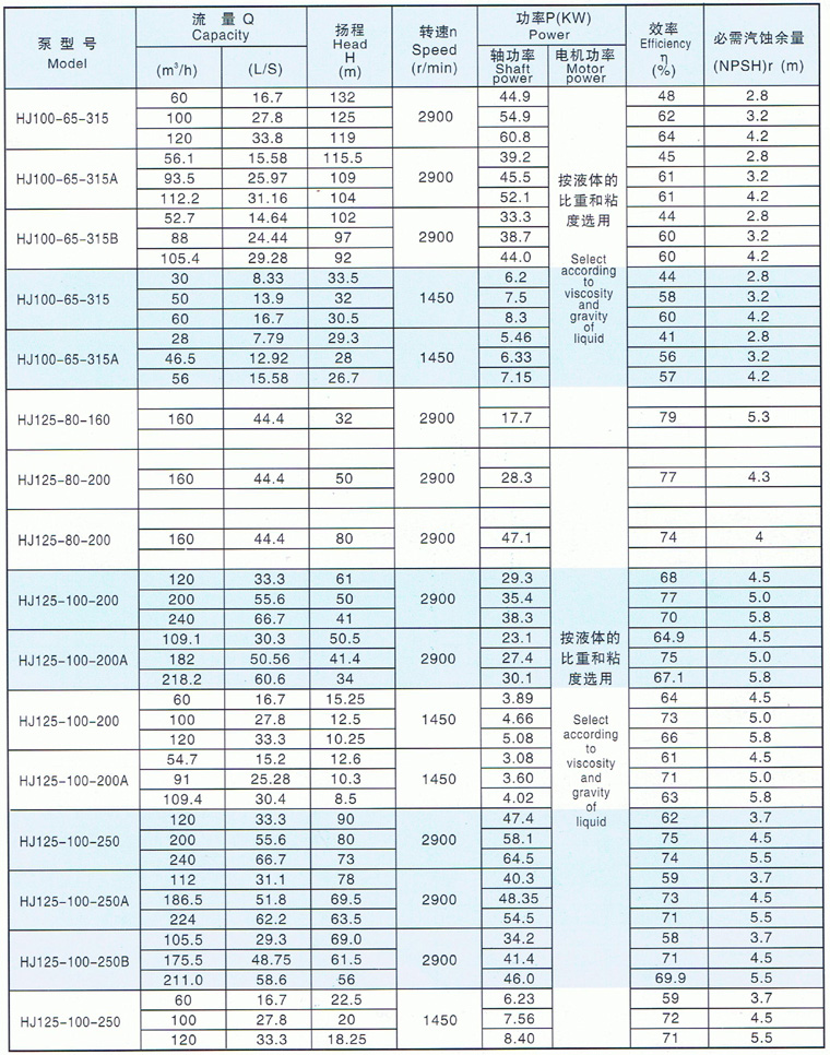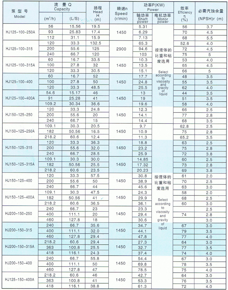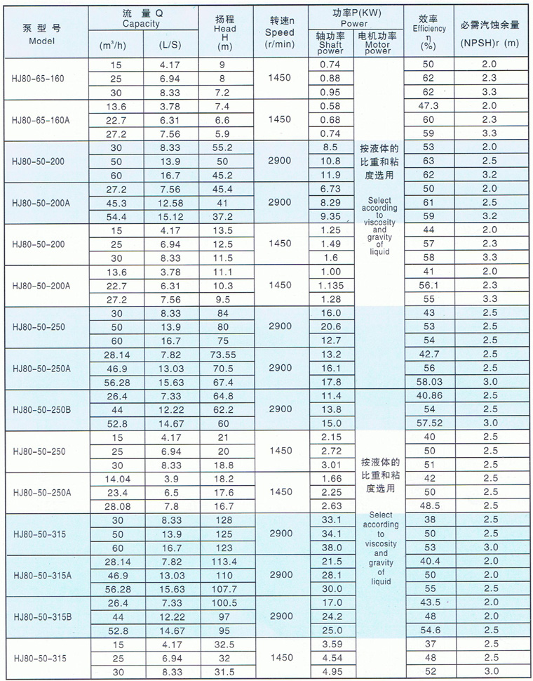 HJ型化工離心泵工作性能表 |