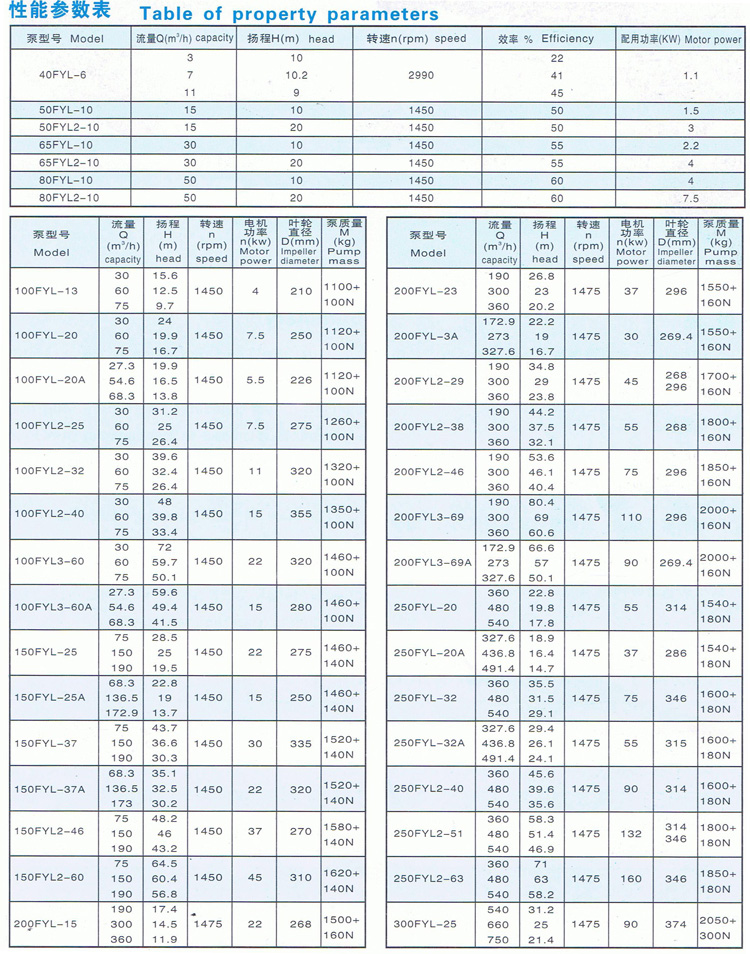 FYL系列立式長(zhǎng)軸泵工作性能表 |
