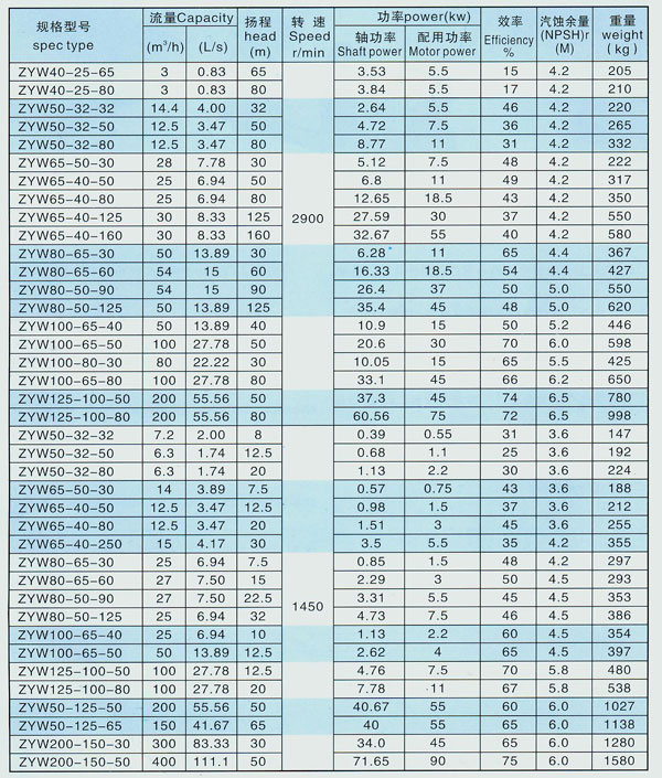 ZYW型無泄漏化工離心泵工作性能表